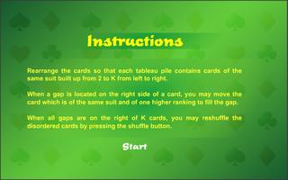 填写空白并安排您的甲板!您在此游戏中的任务是重新排列卡,以便每个Tableau桩从左到右都包含从2到K的相同西装的卡片。游戏开始时,将均匀地分布在4台塔桩上。然后将删除4个ACE,并出现4个差距。当差距位于卡的右侧时,您可以单击并拖动同一西装的更高排名卡以填补间隙,例如,当缝隙在2杆子的2个右侧时,您可以移动三个黑桃以占据空位置。图片堆上的最左侧间隙将用2填充。如果所有缝隙都在k卡的右侧,则无法将卡移到空的空间中。在这种情况下,您可以按下屏幕顶部的洗牌按钮,以便可以对尚未订购的卡进行重新封装。您将以60000分的速度开始游戏,但是您采取的每一步都会扣除100点,而改组将花费您10000点,因此请做出明智的决定以实现您的目标!